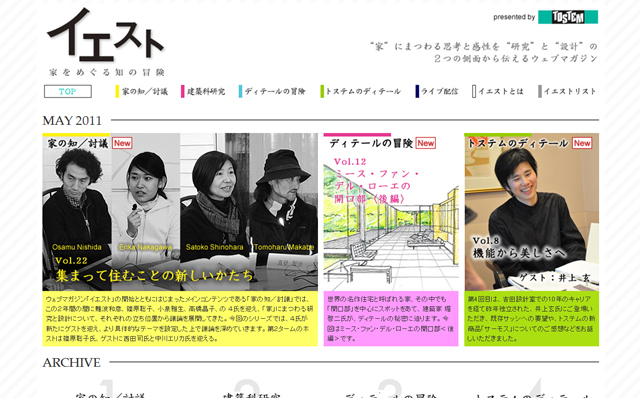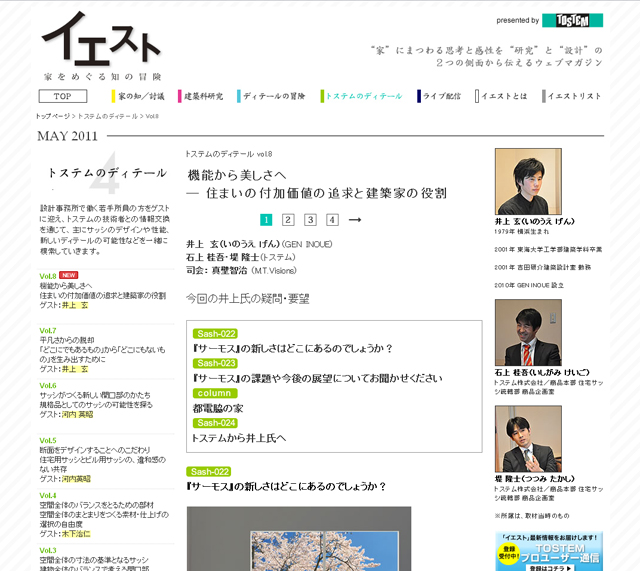 “家”にまつわる思考と感性を“研究”と“設計”の2つの側面から伝えるウェブマガジン「イエスト」。その中の「トステムのディテール」でインタビューされた記事が掲載されています。これはトステムの技術者との情報交換を通じて、主にサッシのデザインや性能、新しいディテールの可能性などを一緒に模索していくコーナーです。後編は新商品「サーモス」についての内容です。私も積極的にこの商品を使っていこうと思っています。