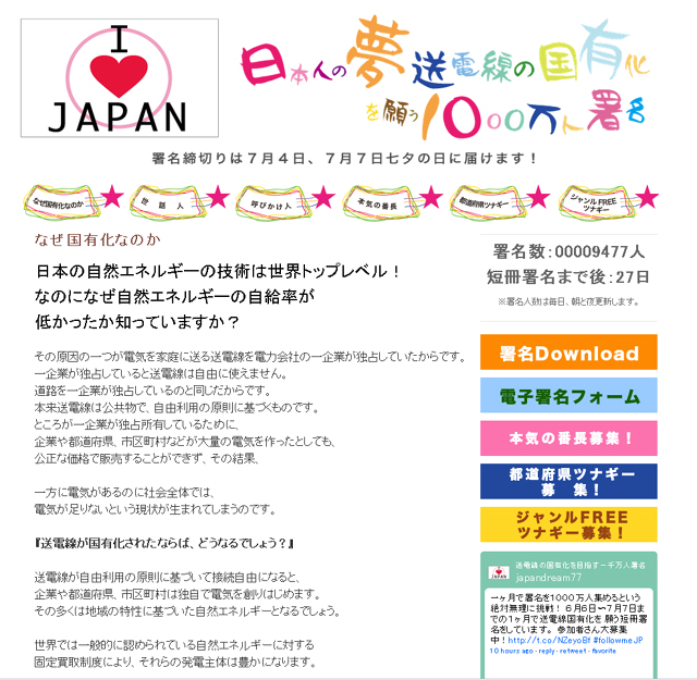 一ヶ月で署名を1000万人集めるという絶対無理に挑戦! 6月6日〜7月7日までの1ヶ月で送電線国有化を願う短冊署名をしています。 賛同いただける方はhttp://maketheheaven.com/japandream/ をご覧下さい。ホームページ内からも電子署名が可能です。<お問合せ先:JAPAN DREAM 事務局>