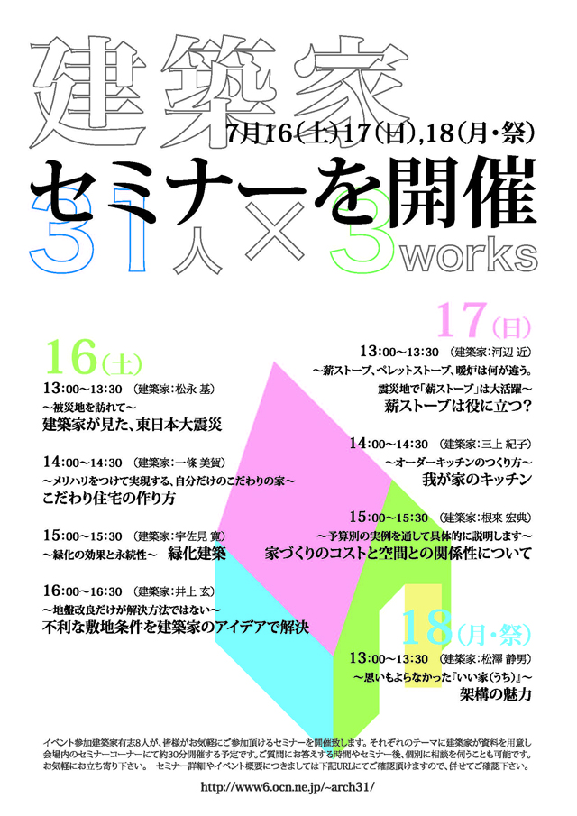 2011年7月15日(金)~18(月・祭)まで新宿パークタワー1Fで「建築家31人×3works」が開催されます。今回は模型やパネル展示に加え、数名の建築家がそれぞれ用意したテーマでセミナーを開催します。