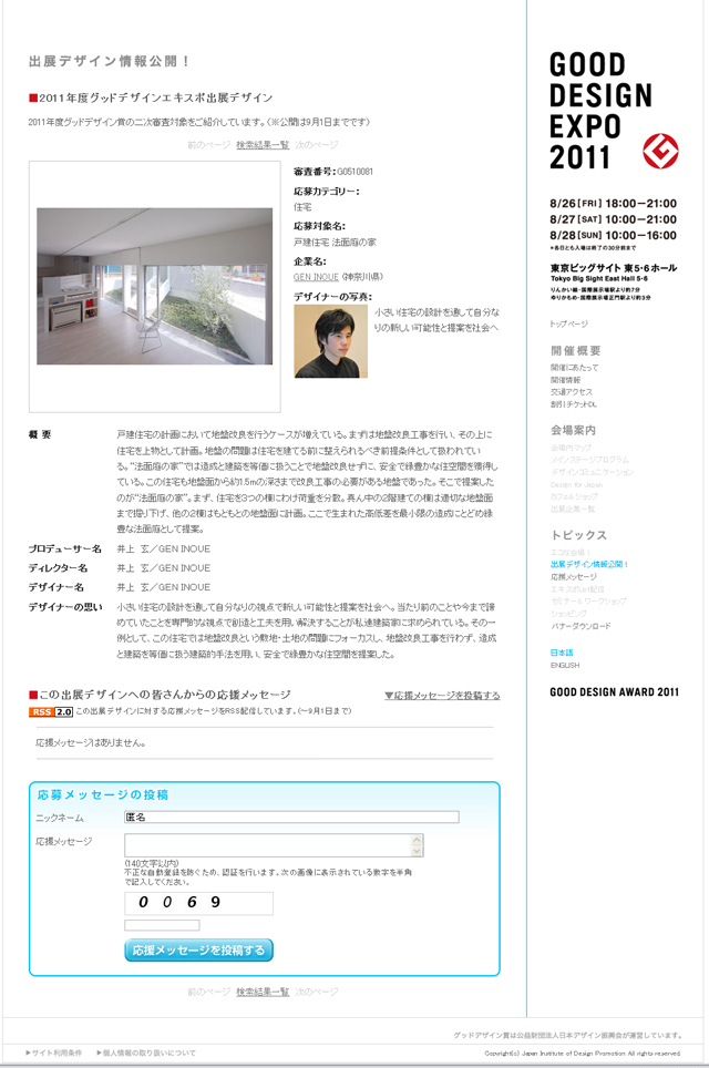 「GOOD DESIGN EXPO 2011」の一環として、【法面庭の家】に対する皆様からの応援メッセージをお待ちしております。下記URLからアクセスいただき、応援メッセージをお願い致します。