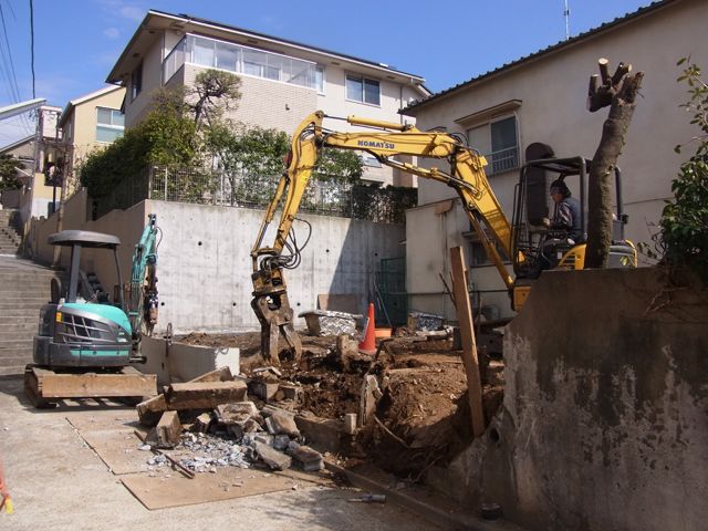 2012年2月13日 通常より手間がかかったが、約2週間でウワモノの解体が終わった。前面道路は42条2項道路でセットバックの必要があり、既存の塀はその範囲内にあるため解体の必要がある。大田区では解体・整備に対する助成金の制度があり、解体前に写真や寸法を予め記録しておいた。 クライアントであるisaya-hさんの家づくりレポートがハウスコホームページ内で紹介されていますので併せてご覧下さい。http://www.houseco.jp/partner_compe/report/38
