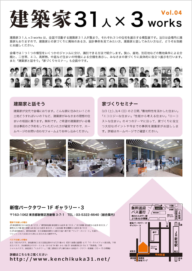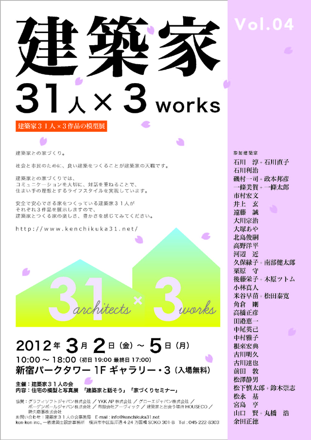 今回で4回目となる建築家が主催するイベント・「建築家31人×3works vol.4 」が3/2(金)から4日間、新宿パークタワーで開催されます。それぞれの建築家が3つの住宅の模型とパネルを展示します。展示では、1つ1つの模型をいくつかのジャンルに分け、会場で識別できる方法で紹介します。狭小地、崖地、別荘地などの敷地条件による分類や、二世帯、エコハウス、高断熱、中庭などの住まいの特徴による分類を表示し、皆さんの家づくりに具体的に役立つ展示を行います。私は3/3(土)3/4(日)ともに10:00から17:00まで会場におりますので、お気軽にお声掛け下さい。 イベント概要 < 日時:2012年3月2日(金)~5日(月) 10:00~18:00(最終日17:00) 場所:新宿パークタワー1F パークタワーギャラリー3 入場料:無料 イベント専用URLはhttp://www.kenchikuka31.net/ >