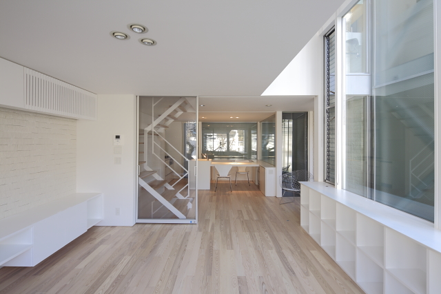2012年1月27日 外構などの工事が引き続き行なわれているが、無事引渡しを終え引越し前のLDK。都心の密集住宅地でこの大開口を設けられるのは、その更に隣地側(外側)にプライバシーを守り、光を通す「解放壁」を設けているため。内部の吹抜けがあり、外部の吹抜けがあり隣地境界上に型ガラスの「解放壁」が計画されている。