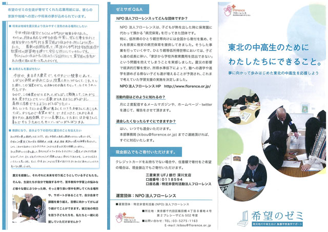 震災から半年たった2011年9月11日、GEN INOUEでは撮影料の1%を継続的に震災復興募金することに決めました。被災された方への支援と復興の想いが時間の経過とともに薄れていかないよう。2012年4月からは日本赤十字社ではなく、特定非営利活動法人フローレンスの活動の一つ、「希望のゼミ」へ募金することにしました。これは東日本大震災によって厳しい環境下におかれた岩手、宮城、福島の中高生の学習・進学サポートを通し、東北地方の力強い復興を応援するのと同時に、学習指導員を被災された地元の塾事業者へ委託することにより、中高生への支援だけでなく被災地現地の雇用・経済復興の足がかりを応援することができるプロジェクトのようです。詳しくは http://kibounozemi.jp/support.html