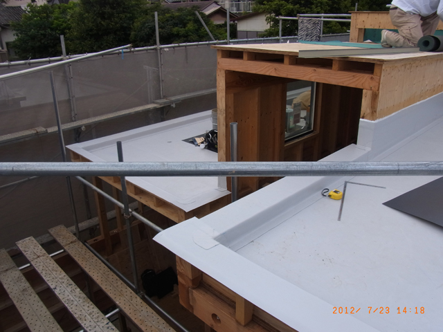 屋根の施工が進められている。陸屋根部分はシート防水。ペントハウス部分がガルバのスタンディングシーム。アルミサッシも順次取り付けられている。【駐車場のない家】の現場進行状況は、建築主であるisaya-hさんの家づくりレポートでも、建築主の視点で紹介されていますので併せてご覧下さい。http://www.houseco.jp/partner_compe/report/38 http://yukikazetau.blog.fc2.com/