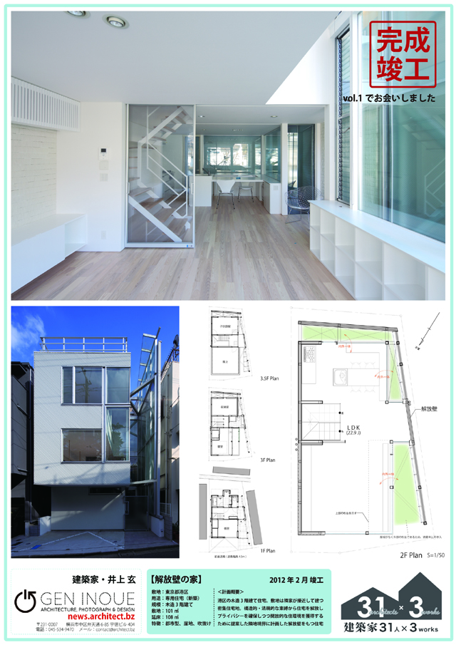 企画イベントである『建築家31人×3作品の模型展で出会いスタートしたプロジェクト』に出展するGEN INOUEの3プロジェクトを紹介します。1つ目は【解放壁の家】。『建築家31人×3作品の模型展』vol.01でお会いしプロジェクトが始まり、2012年2月に竣工した港区の木造3階建て住宅です。密集住宅地にある19坪の敷地で、プライバシーを守りながら開放的な内部空間を手に入れるために計画した“解放壁”が特徴の住宅です。