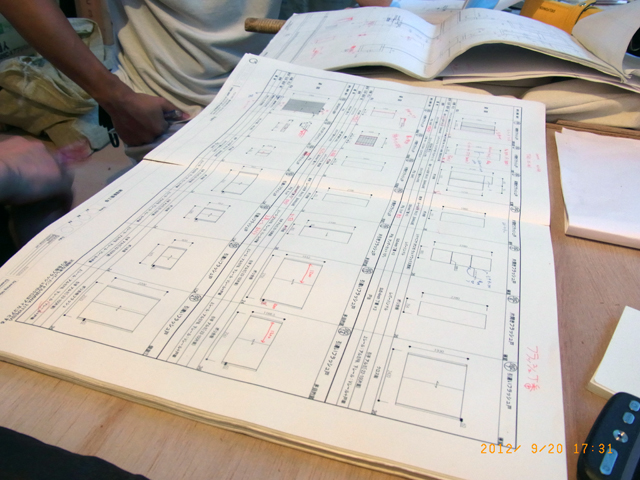 今日は建具屋さんとの二回目の打合せ。既製品の扉は一つもなく、すべて造作建具。天井いっぱいの高さは当たり前。素材も周囲の壁などにあわせ、ポリ合板、タモ、セン柾ベニヤ、シナベニヤなど様々な素材の扉を計画中。レバーハンドルや引き手、鍵や錠、すべて一つ一つ丁寧に選ぶ。