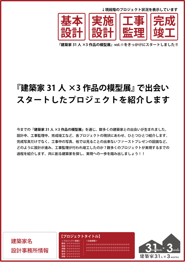 今回は企画イベントとして『建築家31人×3作品の模型展』で出会いスタートしたプロジェクトを紹介します。今までの『建築家31人×3作品の模型展』を通じ、数多くの建築家との出会いが生まれました。 設計中、工事監理中、完成竣工など、各プロジェクトの現状にあわせ、ひとつひとつ紹介します。 完成写真だけでなく、工事中の写真、他では見ることの出来ないファーストプレゼンの図面など、 どのように設計が進み、工事監理が行われ竣工したのか?数多くのプロジェクトが実現するまでの 過程を紹介します。共に創る建築家を探し、実現への一歩を踏み出しましょう!!