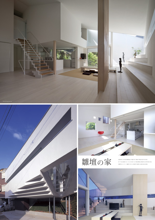 GEN INOUEがある宇徳ビルのエントランスホールで行われている『ヨンカイテン』。9/8(土)から9/28(金)までの20日間は私達の展示期間。B0サイズのパネル5枚と模型をつかって活動を紹介します。9/12(水)から9/18(火)の第二回目は【雛壇の家】。 道路境界にある既存擁壁撤去の問題や崖下敷地の制限を総合的に解決。崖下である南側からも十分に光を取り入れる断面構成は開放的な内部空間を実現。閉鎖的なコンクリート擁壁の代わりに開放的で緑豊かな緑化斜面を提案。