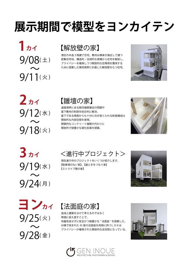 GEN INOUEがある宇徳ビルヨンカイの1階エントランスホールの一部を使って、ヨンカイメンバーの活動を紹介する【ヨンカイテン】が行われている。9/9(土)から9/28(金)までの20日間は私達の展示期間。B0サイズのパネル5枚と模型をつかって活動を紹介します。20日間を4分割し、それぞれ違った模型を展示します。お近くにお越しの際はご覧下さい。