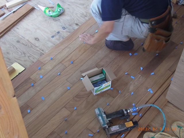 LDKはもちろん、子供部屋のフローリングも無垢フローリング。建築主さんがご自身で探してこられた「ムニンガ」。床暖房にも対応し値段も比較的安い。LDKはこのフローリングで貼り方をひと工夫。【駐車場のない家】の現場進行状況は、建築主であるisaya-hさんの家づくりレポートでも、建築主の視点で紹介されていますので併せてご覧下さい。