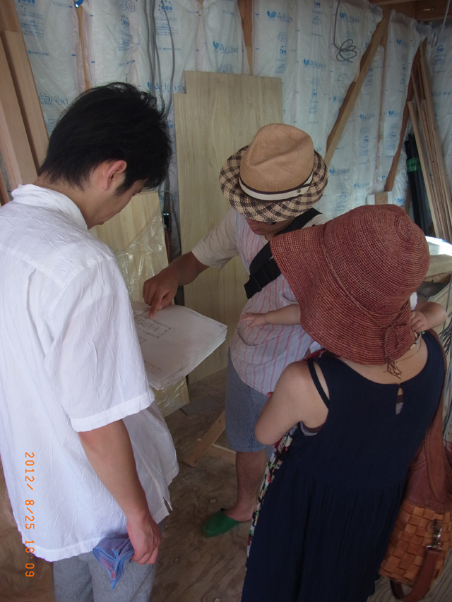 快晴。ご家族揃って現場に来て頂き現場での打合せを行った。お施主さんから職人さんへ果物や飲み物の差し入れを頂いた。内部の壁や天井が貼られる前に、スイッチやコンセントなどの配線関係の再確認を一部屋一部屋行った。【駐車場のない家】の現場進行状況は、建築主であるisaya-hさんの家づくりレポートでも、建築主の視点で紹介されていますので併せてご覧下さい。http://www.houseco.jp/partner_compe/report/38 http://yukikazetau.blog.fc2.com/