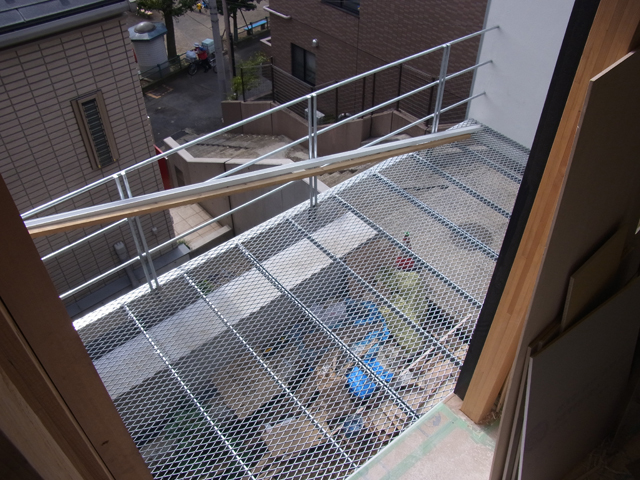 南側バルコニー。バルコニー下部の玄関アプローチや土間空間への光を遮らないようにエキスパンドメタルで計画している。幅4m奥行き1.9mの大きさでこの開放感はこの素材でしか得られない。素材は鉄であり、錆びないようペンキではなく、電柱の仕上にみられるようなメッキとしている。