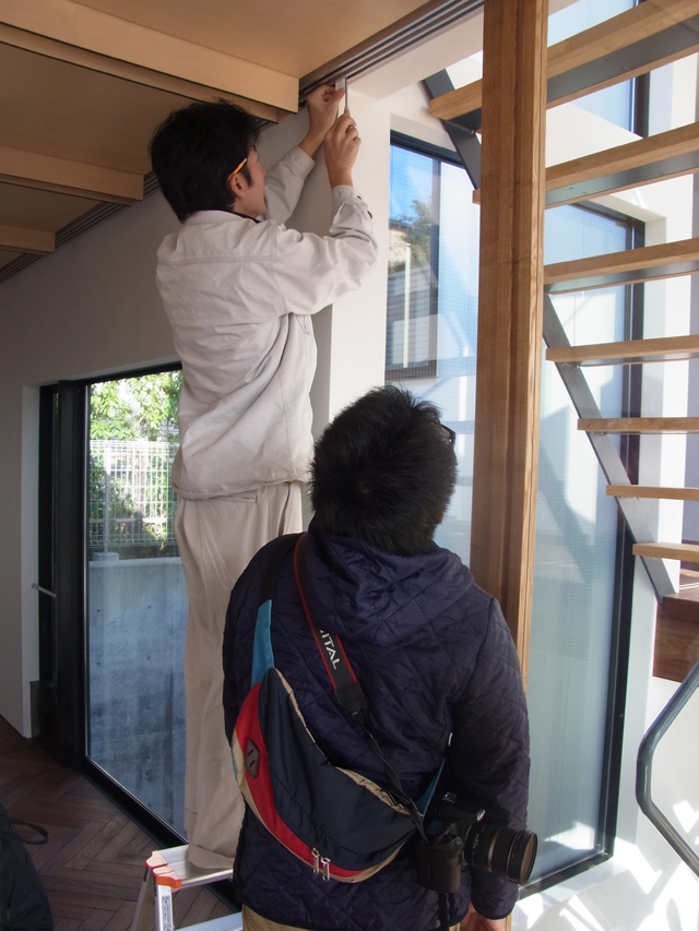 11月29日 取り扱い説明を行い、鍵や確認申請の副本などの受け渡し終え、無事、引渡しを行いました。写真は建具の説明をしているところです。実は、建具に少し工夫があります。詳しくは竣工写真を使って次回以降、紹介させて頂きます。