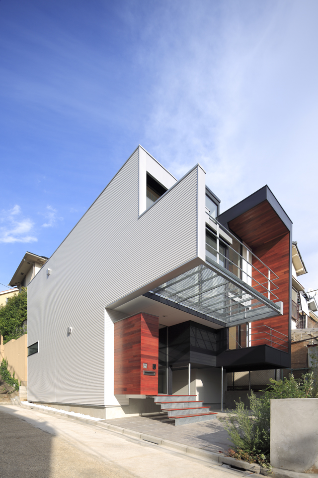 南側(写真右側)の既存擁壁からセットバックするため、建物の重心は北側によっている。つまり、基礎や1階部分は北側によせ、2階やバルコニーは柱無しのキャンティで南側に張り出している。既存擁壁に建物の荷重がかからないための安息角が大田区で決まっている。一般的な解決方法は深基礎とすることで、本計画では、擁壁から基礎を離し、上部を木造キャンティで計画することで解決した。道路側の壁は、大きな梁の役割を担い約2mのキャンティを可能にした。
