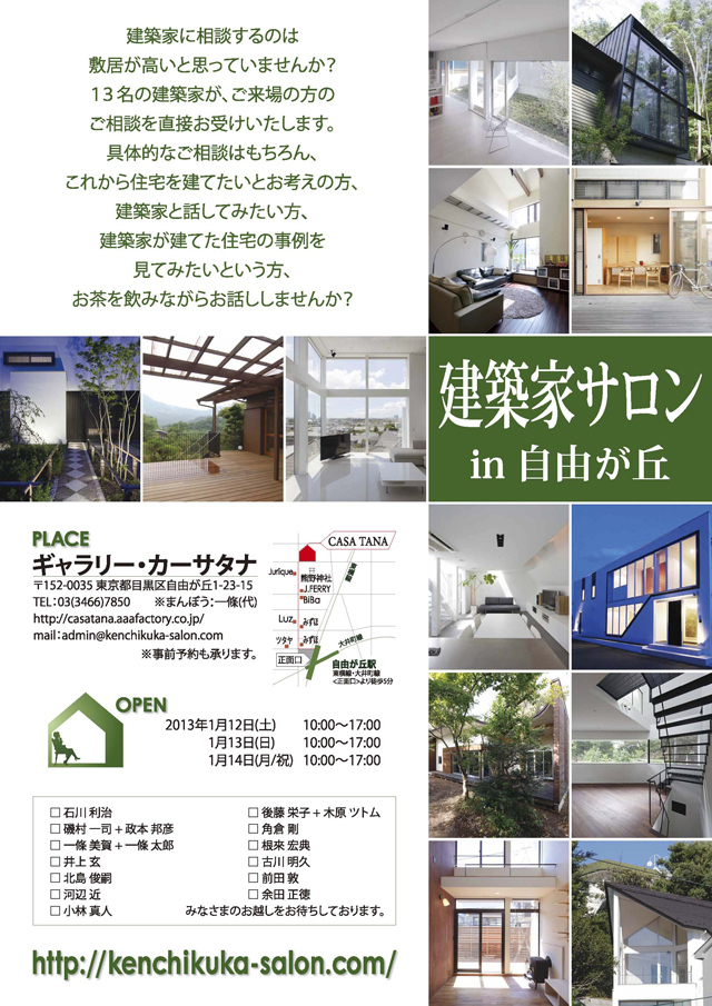 2013年1月12(土)から14(月・祭)まで、自由が丘の「ギャラリー・カーサタナ」(http://casatana.aaafactory.co.jp/index.html)で住宅相談会を行います。「31人展」(http://www.kenchikuka31.net/)のメンバーから13人の有志が集まります。当日は、建築家が模型と写真を展示し、お待ちしてます。会場での個別相談も承っておりますので、お気軽にお越しいただき、お声掛け下さい。建築家の滞在スケジュールなど、詳しくはイベント専用URLをご覧下さい。http://kenchikuka-salon.com/index.html
