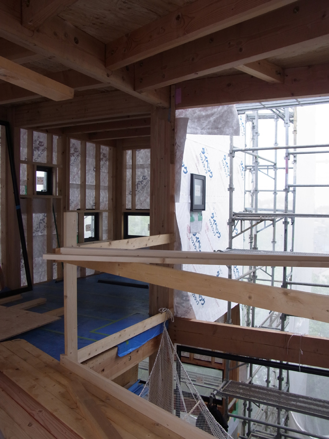 建て方の後、構造検査を行い、アルミサッシの取り付け。