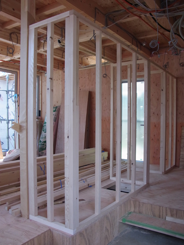 2013年5月18日 耐力壁はできるだけ外周部に集約している。パントリーとキッチン。主寝室とクローゼットの間仕切壁は、天井まで届かずに上部があいている。これは家の中心に、できるだけ光を入れることが目的で、開けっ放しの部分もあれば、ガラスを設置し、音や匂いをシャットアウトする場合もある。