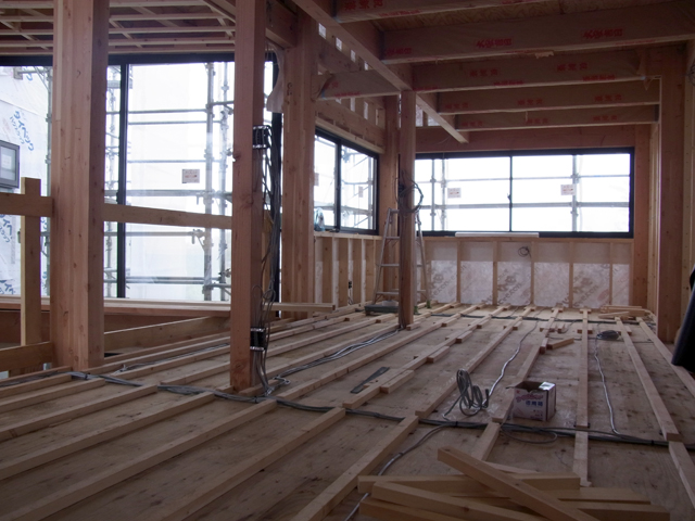 1階リビングの天井が 2″×10″ 材を化粧で見せるため天井懐がない。露出配線を避けるために、電気配線の経路を確保すべく、2階の床に根太を計画している。