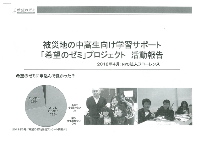 震災から半年たった2011年9月11日、GEN INOUEでは撮影料の1%を継続的に震災復興募金することを決めました。被災された方への支援と復興の想いが時間の経過とともに薄れていかないよう。2012年4月からは日本赤十字社ではなく、認定特定非営利活動法人 フローレンスの活動の一つ、「希望のゼミ」へ募金することにしました。これは東日本大震災によって厳しい環境下におかれた岩手、宮城、福島の中高生の学習・進学サポートを通し、東北地方の力強い復興を応援するのと同時に、学習指導員を被災された地元の塾事業者へ委託することにより、中高生への支援だけでなく被災地現地の雇用・経済復興の足がかりを応援することができるプロジェクトです。詳しくは http://kibounozemi.jp/support.htmlをご覧下さい。
