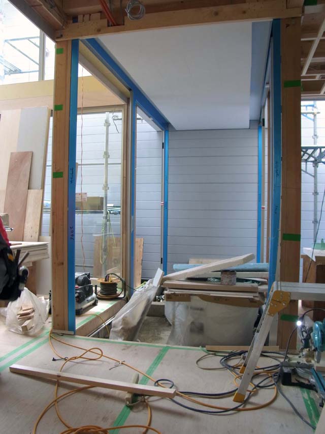 南側には隣家がそびえ立ち、採光もプライバシーも期待できなかった。そこで、住宅本体と切り離した壁を一枚立て解決できないかと考えた。構造的には一体だが、その壁と住宅との間は抜けていて、「ライトコート」となっている。空が見えるし雨も降る。ここに植栽し、住宅側に大開口を計画し、プライバシーが守られた開放的な空間を獲得した。横筋のサイディングはこれから白く塗装され、内部と一体化をはかる。
