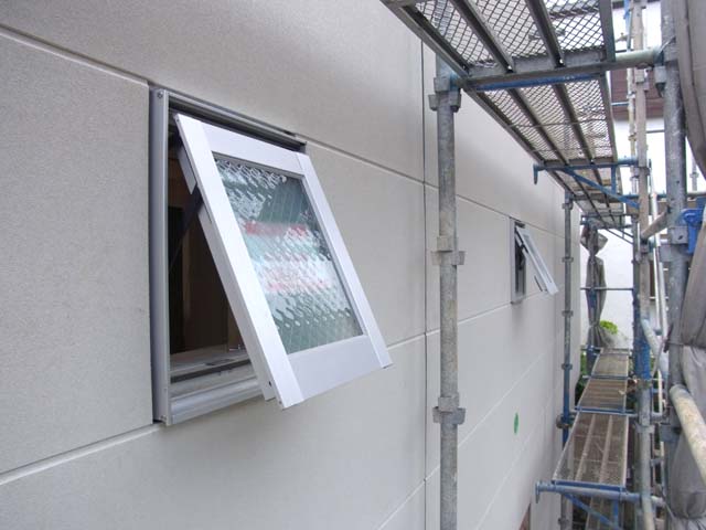今回のサイディングは、ウベボードから出ている「砂美」の白砂色。はじめて使うサイディングだが、マットな仕上がりが良い。このサイディングの目地に、全ての開口部を揃え、緊張感をもたせている。