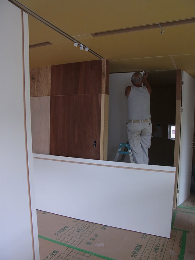 大工工事が終了し、建具屋さんが現場に入った。最後のラストスパートは、塗装屋さんクロス屋さんなど、仕上げ関係の方がこれからの主役。