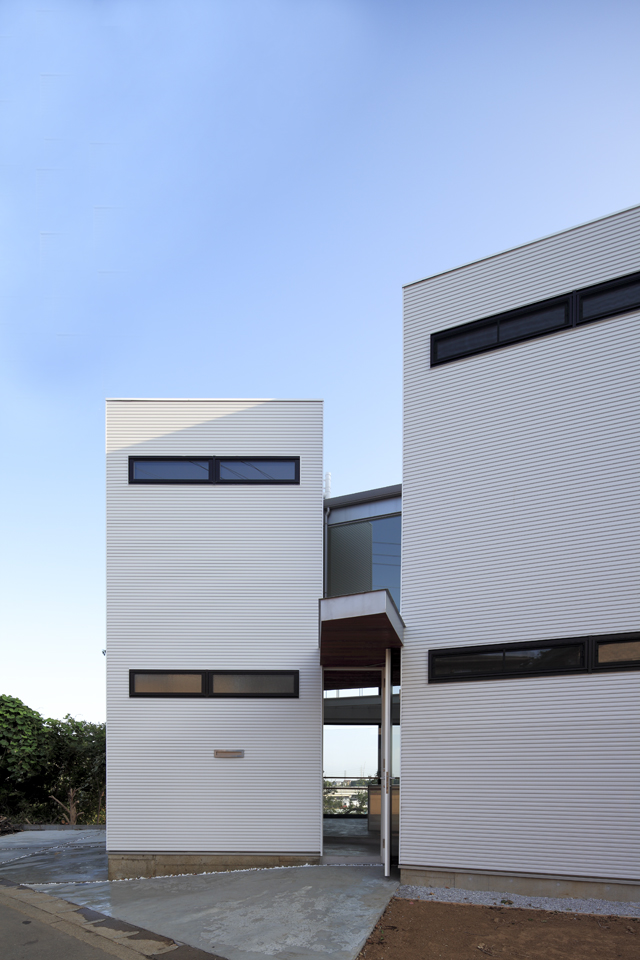 北側前面道路から南側の景色が抜ける。それぞれの崖に対し直交して配置された二棟の間が玄関、吹き抜け、南側のデッキスペースと連続しており、玄関扉を締めても南側の景色が見える。