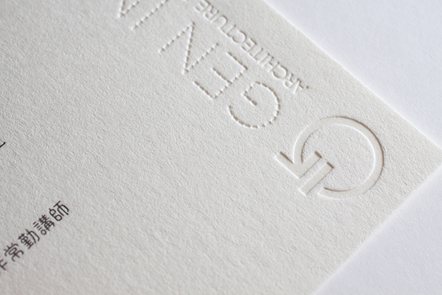 名前や連絡先などは1色で刷り、ロゴを箔押しで添えるシンプルな名刺としました。井上氏とスタッフの坂本氏の二種類を制作することになり、サイズやレイアウトは共通とし、紙種・インクの色・箔押しの仕様をそれぞれで変えてデザインしました。井上様の名刺は繊維質の綺麗なテクスチャを持つOKフロートを使用し、少し表情を落ち着かせるダークグレーで印刷。これにOKフロート特有の表情が出るホットスタンピング加工でロゴを加えました。坂本様の名刺は、重厚感のあるGAボードのダークブルーを使用し、明るい色でも文字の視認性を確保できるシルバーで印刷。これに、透明系の箔であるエナメル箔を箔押ししてロゴを加えました。サイズは一般的な名刺のサイズである55mm×91mmよりも小さい、55mm×78mmとしました。このサイズは、用紙サイズ(A判やB判)に採用されている白銀比(1:1.414)という比率で、様々なカード類に採用されている黄金比(1:1.618)よりも日本人が好む比率と言われています。印刷風景の写真もありますので、下記も併せてご覧下さい。http://united-lights.com/gen-inoue-business-card/