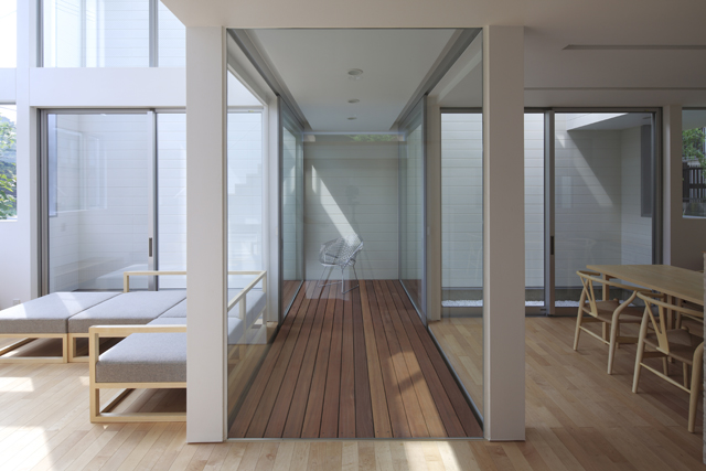 インナーテラスを中央に左右にライトコートが計画されている。左側のライトコートには、吹抜けにあわせて背の高いシンボルツリーを、右側には、ダイニングテーブルに座って干渉できるシンボルツリーを、今週末に植える予定。